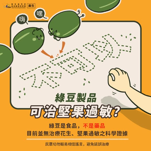 2.雖然網傳綠豆有清熱解毒的效果,含綠豆成分的製品對某些人亦可能引起過敏反應。且綠豆為食品非藥品,目前並無治療花生、堅果過敏之科學證據,民眾切勿輕易相信謠言,避免延誤治療。