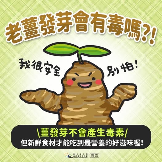 2.雖然薑發芽沒有毒,但是腐爛的薑可能會產生黃樟素,目前黃樟素被國際癌症研究機構(IARC) 列為第2B 類物質,雖無證據顯示會對人類致癌,且對動物致癌性證據有限或不足,故仍不建議民眾使用。